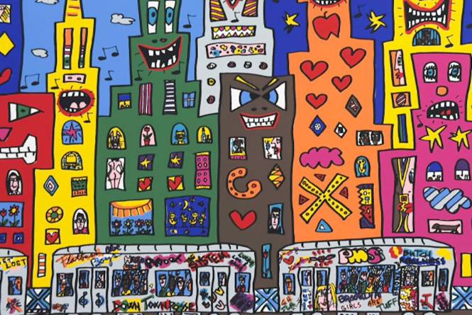Image (detail): James Rizzi, Take the A Train to Harlem. 1989, Lithograph. From the Collection of the Dennos Museum Center.