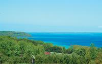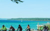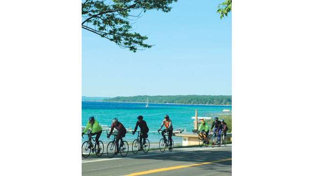 The Traverse City Cycling Club biking on Old Mission Peninsula with a view of West Grand Traverse Bay.