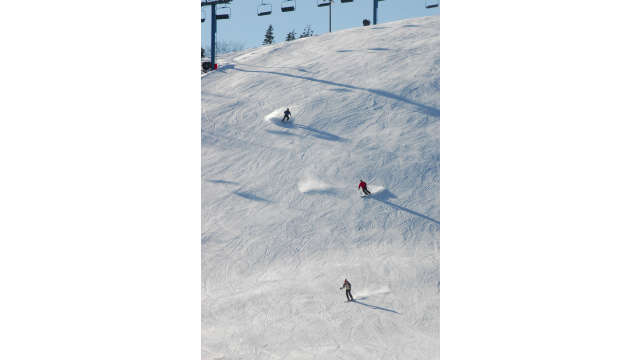 Skiers hitting the slopes on Schuss Mountain at Shanty Creek Resorts.